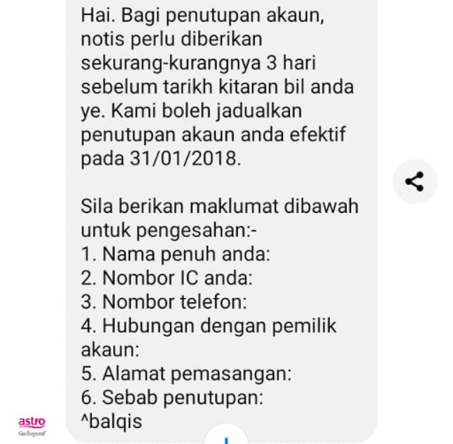 - Pihak Astro akan memaklumkan tempoh penutupan akaun dan maklumat yang perlu disertakan untuk tujuan pengesahan.