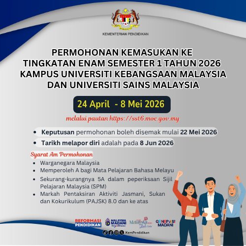 Bagi tahun 2026, Kementerian Pendidikan Malaysia (KPM) telah membuka semakan tawaran kemasukan ke Tingkatan Enam Semester 1, termasuk peluang khas belajar di kampus universiti seperti UKM dan USM.