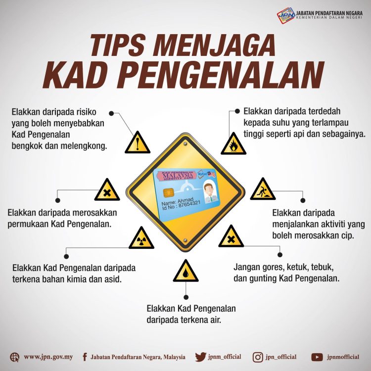 Berikut adalah beberapa tips menjaga Kad Pengenalan seperti yang dikongsikan oleh JPN: