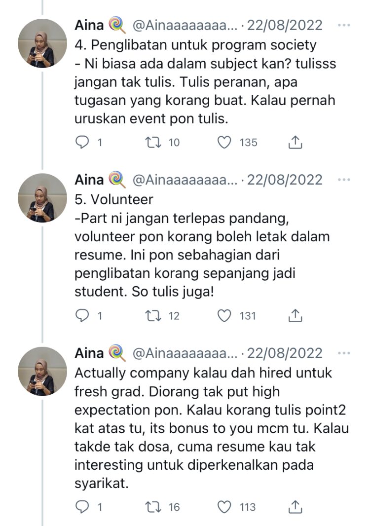 “Actually company kalau dah hired untuk fresh graduate, mereka tak pun high expectation pun. Kalau mereka tulis point-point kat atas tu, itu adalah bonus untuk anda.”