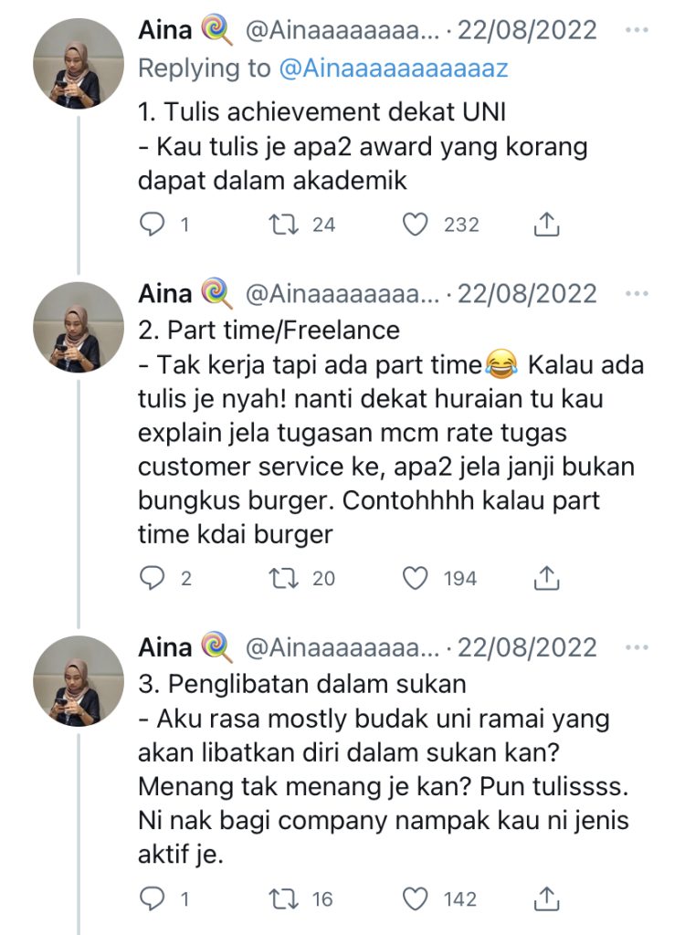 “Actually company kalau dah hired untuk fresh graduate, mereka tak pun high expectation pun. Kalau mereka tulis point-point kat atas tu, itu adalah bonus untuk anda.”