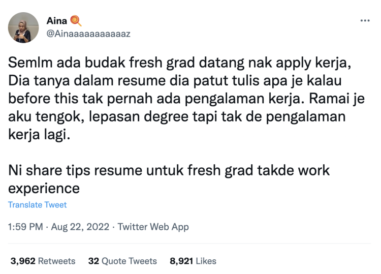 Melalui laman Twitter, seorang HR ini kongsikan tips resume untuk fresh graduan yang tiada pengalaman kerja.