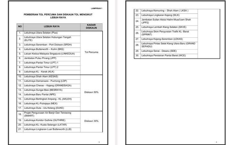 SENARAI LEBUH RAYA MENAWARKAN TOL PERCUMA & DISKAUN
