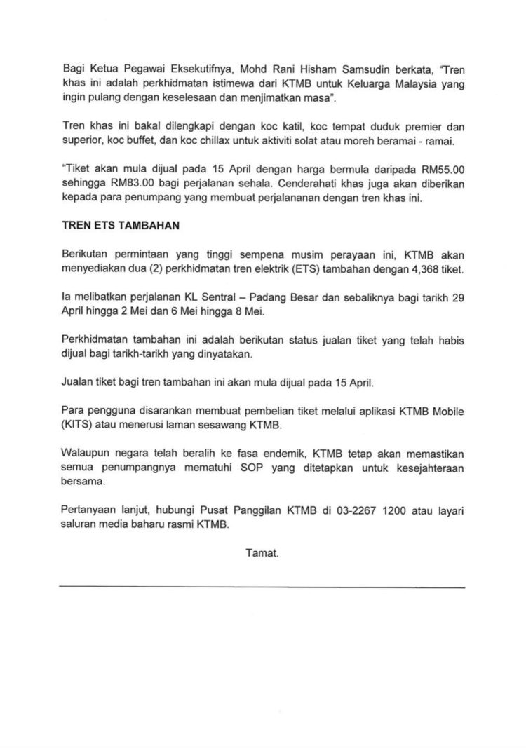 Dalam pada itu, KTMB turut memaklumkan bahawa pihaknya akan menyediakan dua perkhidmatan tren elektrik (ETS) tambahan dengan 4,368 tiket berikutan permintaan yang tinggi sempena musim perayaan kali ini.