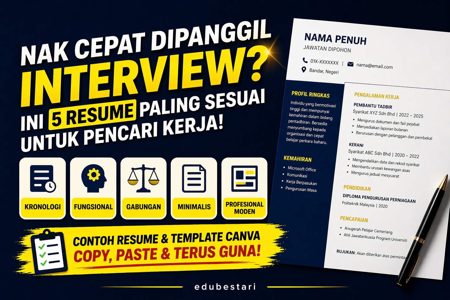 Resume adalah tiket pertama untuk melangkah masuk ke dunia pekerjaan. Kalau resume pun gagal ‘menjual’ diri anda sebagai calon terbaik, bagaimana majikan nak nampak potensi anda? Persaingan sekarang bukan calang-calang. Ratusan calon memohon jawatan sama setiap hari.