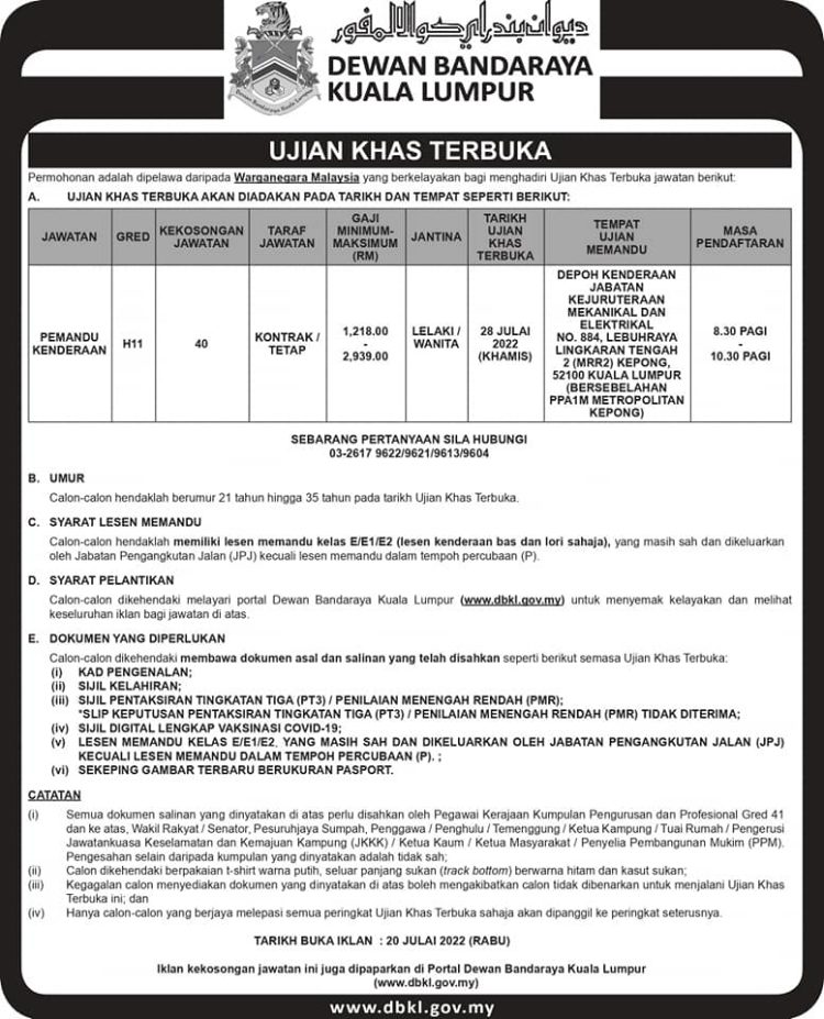 Berminat nak jadi salah seorang daripada anggota Dewan Bandaraya Kuala Lumpur (DBKL)? DBKL mempelawa warganegara Malaysia yang berkelayakan dan berminat untuk menghadiri Ujian Khas Terbuka bagi pengambilan jawatan bertaraf kontrak/ tetap seperti yang diiklankan.