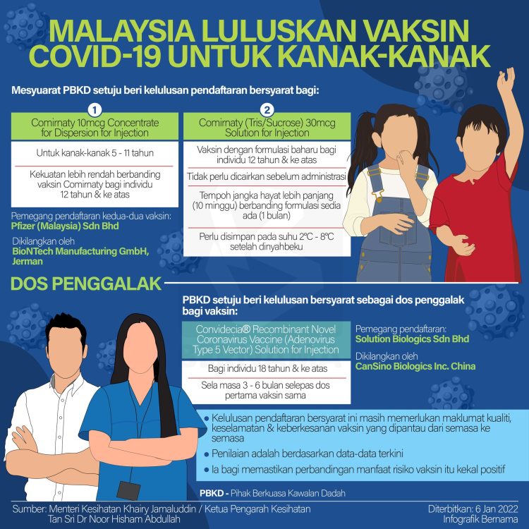 Berdasarkan keputusan daripada Mesyuarat Pihak Berkuasa Kawalan Dadah (PBKD) kali ke-368 yang telah bersidang, Kementerian Kesihatan kini telah meluluskan pemberian vaksin Covid-19 kepada kanak-kanak berumur 5 hingga 11 tahun. Kelulusan pendaftaran bersyarat bagi produk vaksin Comirnaty 10mcg Concentrate for Dispersion for Injection untuk digunakan bagi golongan kanak-kanak itu.