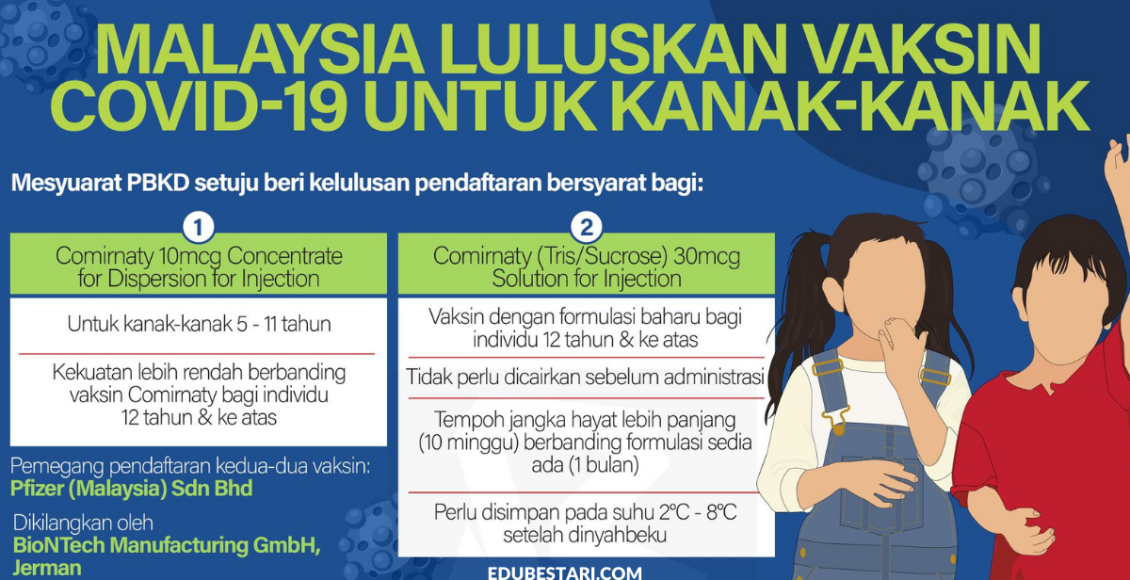 Berdasarkan keputusan daripada Mesyuarat Pihak Berkuasa Kawalan Dadah (PBKD) kali ke-368 yang telah bersidang, Kementerian Kesihatan kini telah meluluskan pemberian vaksin Covid-19 kepada kanak-kanak berumur 5 hingga 11 tahun. Kelulusan pendaftaran bersyarat bagi produk vaksin Comirnaty 10mcg Concentrate for Dispersion for Injection untuk digunakan bagi golongan kanak-kanak itu.