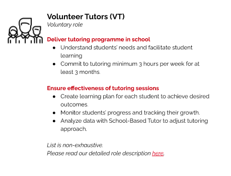 Ikuti perkongsian di bawah untuk maklumat lanjut program Volunteer Tutor yang ditawarkan.