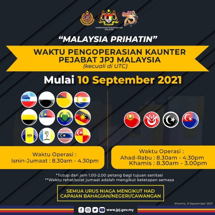 Mulai 10 September 2021, waktu pengoperasian kaunter pejabat JPJ Malaysia adalah seperti berikut: