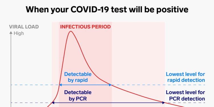 Jika dilihat dari gambar rajah di bawah, untuk virus Covid-19, dia mempunyai viral load dalam badan biasanya paling tinggi masa hari ke 3-5 lepas dia dah masuk dalam badan kita. Sebab itu kebanyakan pesakit akan mula alami simptom semasa hari 3 – 5 ini. Sebab itu seleeloknya bila buat saliva atau swab test masa 3 -5 hari lepas dah mula ada simptom sebab masa itulah viral load dalam badan tinggi.