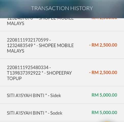 Saya terkejut ade transaksi 2x transfer ke account suami saya sebanyak 5k